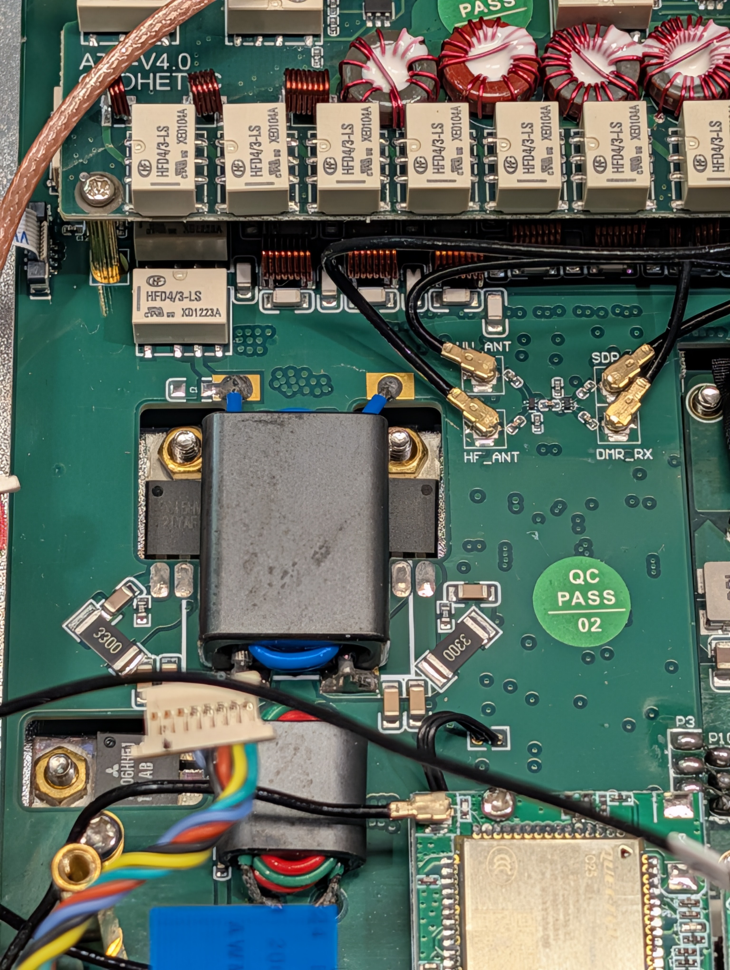 SP8T switch on upper RF assembly board directs the HF filter output to either the 'RX' which connects to the 'HF_ANT' port of the RX combiner/splitter.