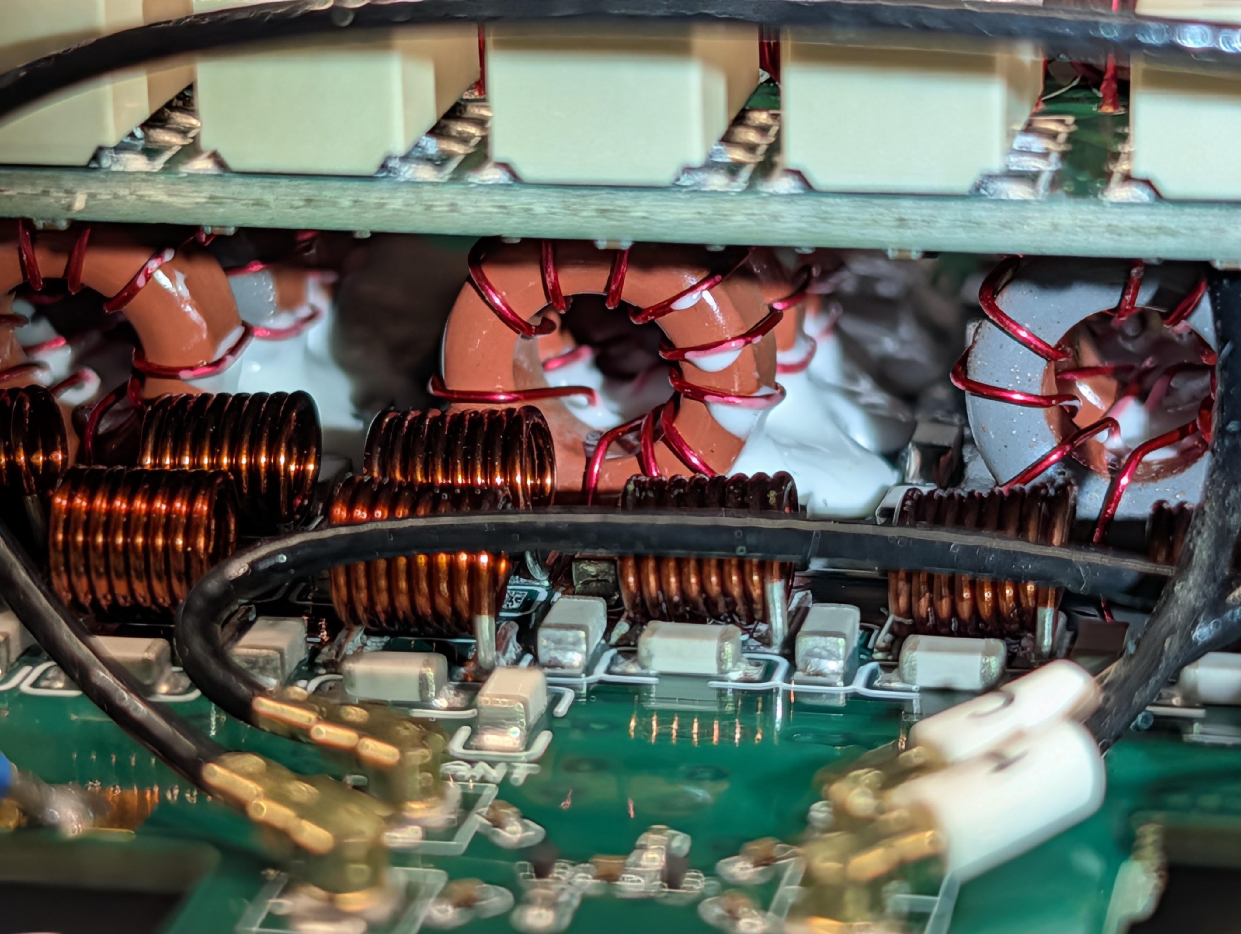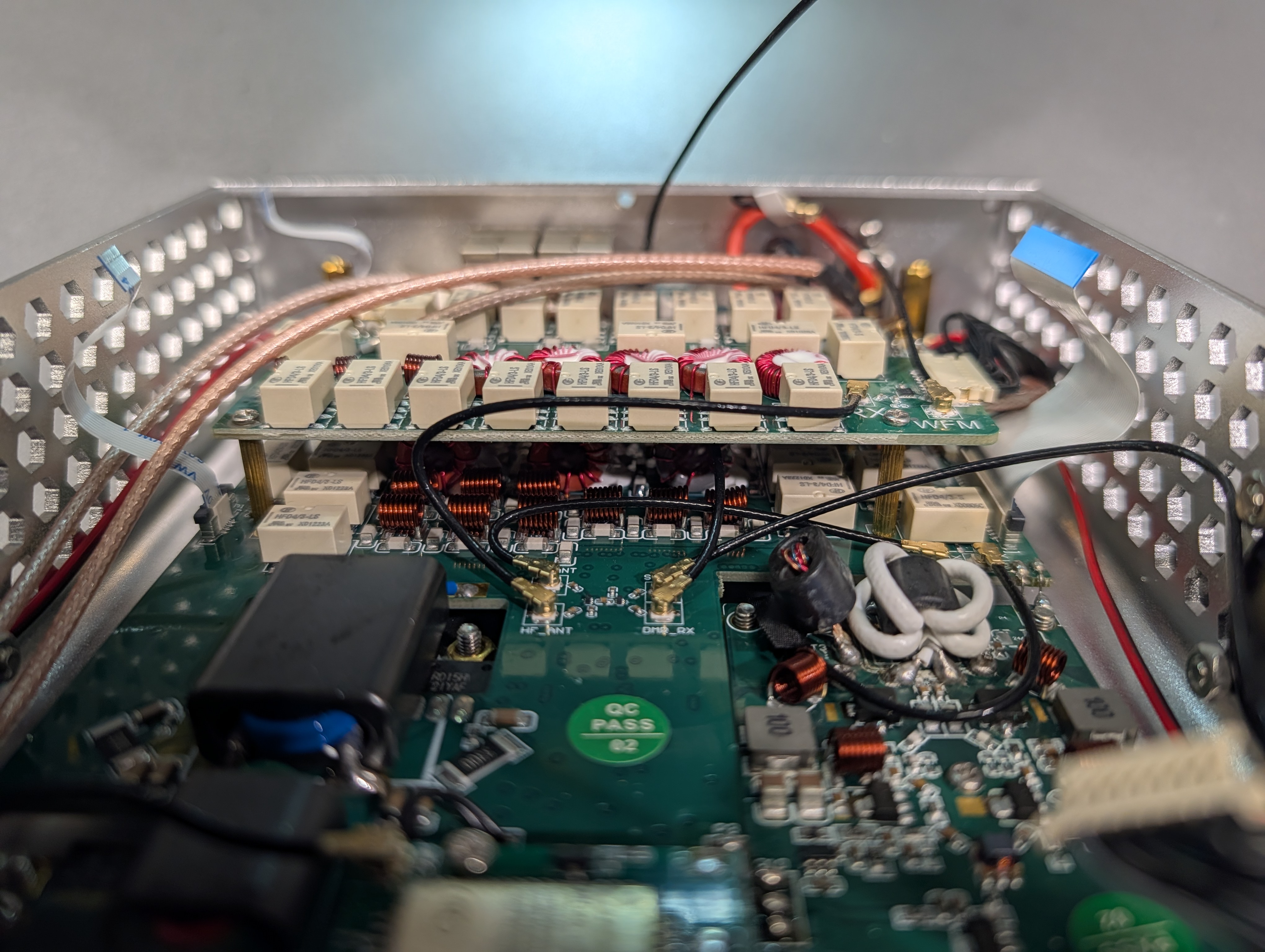 The rear of the bottom assembly is occupied by a multi-level structure of relays, toroids, and coax interconnects. This is the HF antenna tuner. The ATU covers 4m through 160m per the spec sheet, and the density of switching relays and wound inductors here is consistent with a switched L-network or similar topology that steps through combinations of inductance and capacitance to match the antenna. Some of the same relay/toroid assembly likely also handles output filtering to clean up the PA output before it reaches the antenna port, though I didn’t trace that in detail.