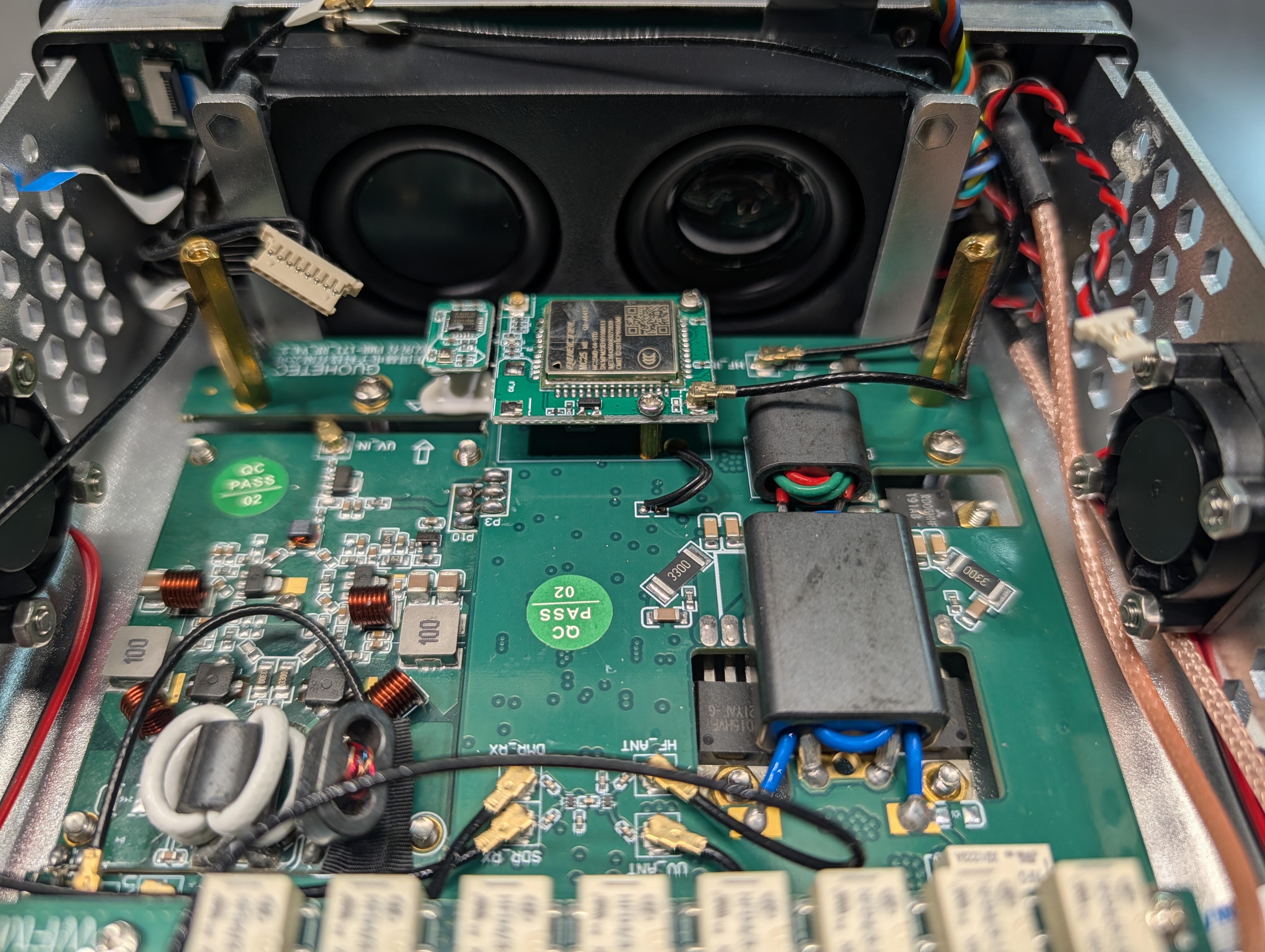 The HF amplifier circuitry is integrated directly onto the main bottom PCB, which takes up most of the assembly footprint. The VHF/UHF amplifier is a separate daughterboard mounted on top — it doesn’t appear to be a generic off-the-shelf module; the construction is consistent with Guohotec’s own hardware, though I didn’t dig further into its provenance.