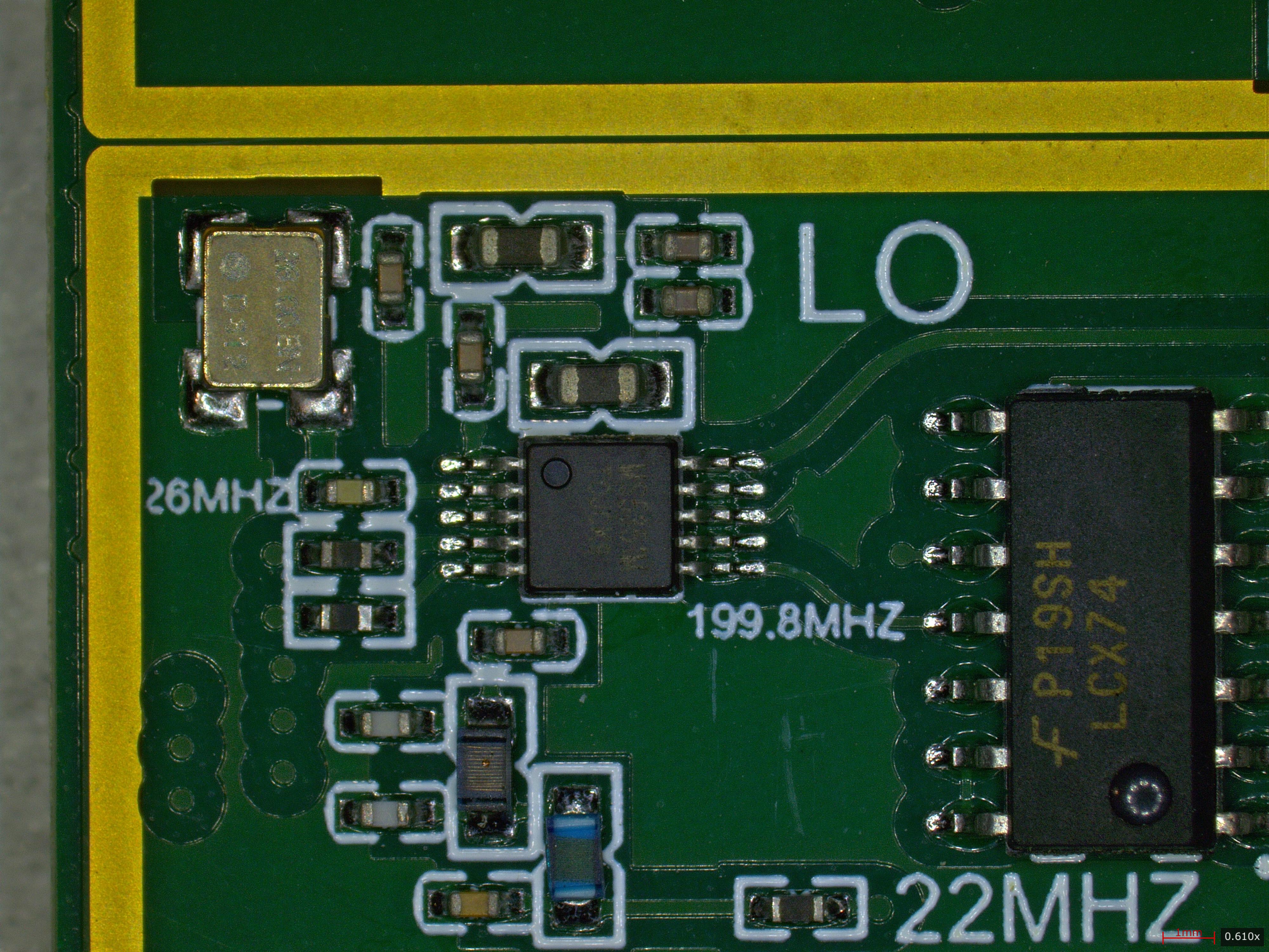 The 49.95 MHz switching clock is derived by running CLK2 (199.8 MHz) through the 74LCX74 configured as a ÷4 divider chain, producing a clean 50% duty-cycle square wave, which is exactly what you want driving a switching mixer.